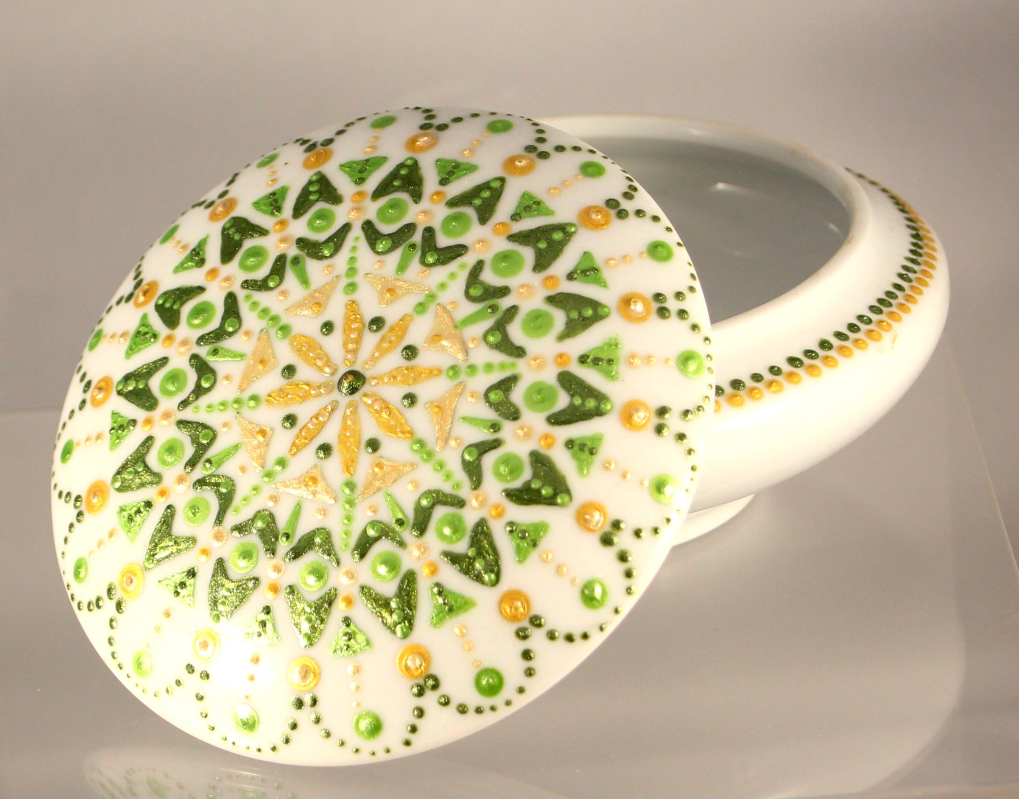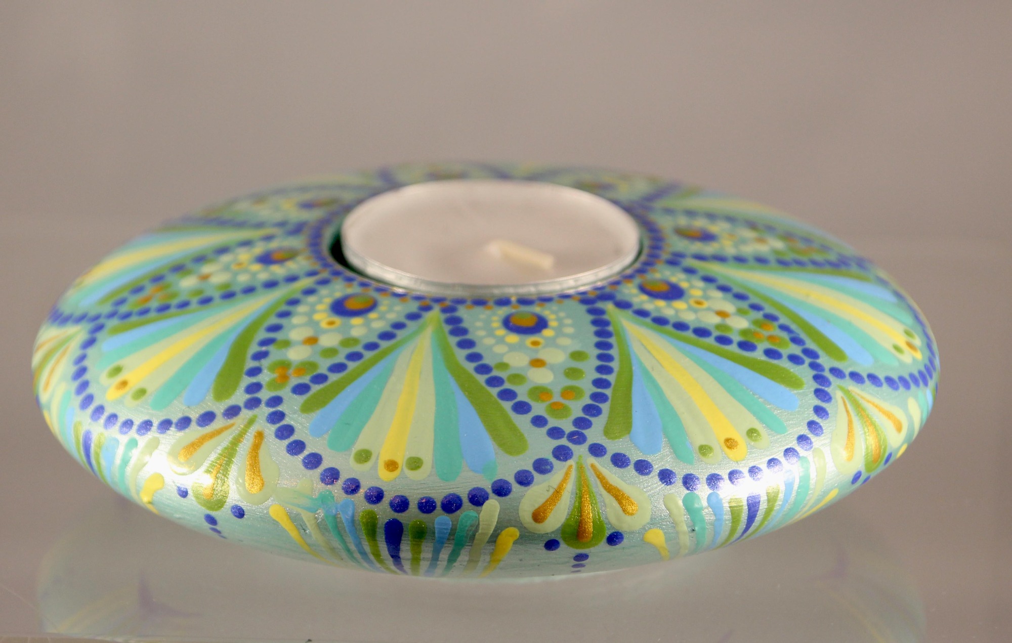 Maar ik stip op meer... Ik maak Mandala's in allerlei formaten. Ook op bestelling overigens. Ik stip op Notitieboeken, op houten Figuren, en ik giet zelf ook gipsen vormen die ik vervolgens bestip. Ach, ideeën te over.. Ook geef ik Workshops. Erg leuk om te doen, en de reacties zijn positief.