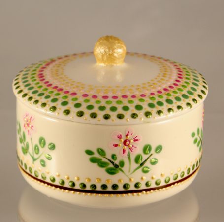 Gerry bestipt alles wat ze tegenkomt in de kringloop. Zo krijgen afgedankte voorwerpen weer een hele nieuwe uitstraling én bestemming. Al het houtwerk wat ze bestipt wordt afgelakt (of afgewerkt met epoxy) om ervoor te zorgen dat de decoratie lekker lang blijft zitten. Het porcelein wordt na het bestippen in de gewone oven gebakken en kan daarna in de vaatwasser op 50º, aldus de verfleverancier. Zij adviseert het voorzichtig te behandelen.